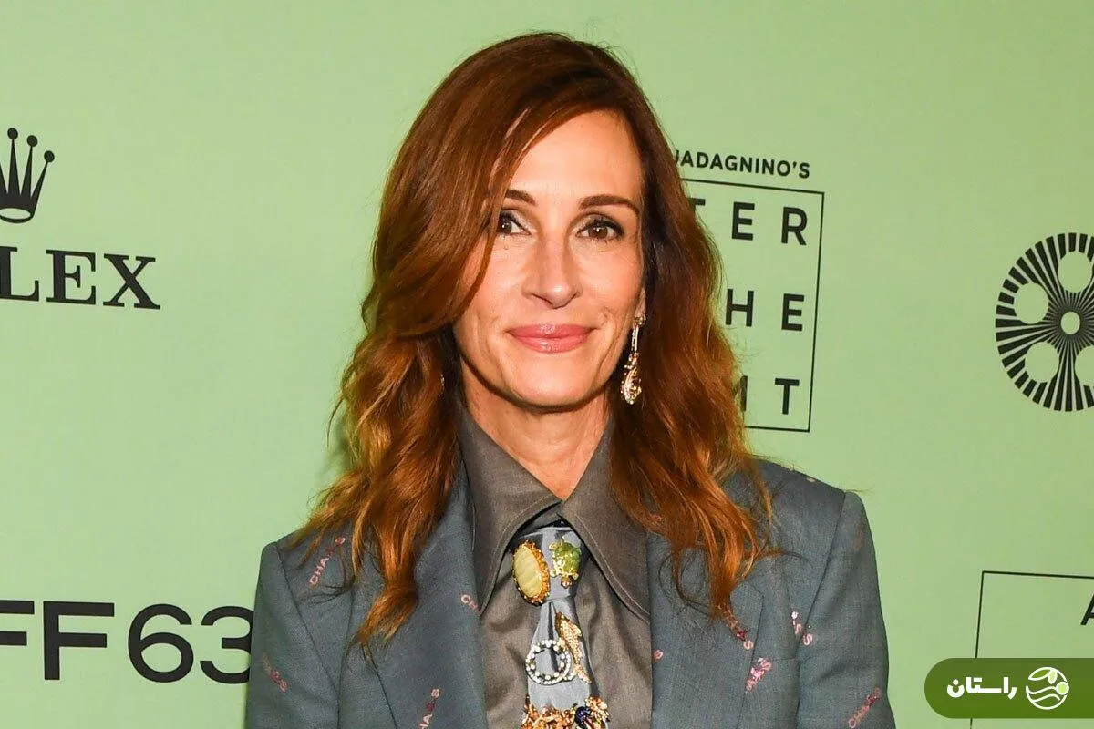 برای این مناسبت خاص، جولیا رابرتز یک کت و شلوار دمپا و البته چشمگیر را انتخاب کرد. این ست آبی-خاکستری دارای یک کت تک دکمه با جیبهای گرد و یقههای اغراق آمیز بود که روی یک پیراهن لباس لایه لایه شده بود. پاچههای شلوارهم تا فرش قرمز پایین افتاده بودند و کفشهای رابرتز را پنهان و جلوهای دراماتیک و لباس مانند ایجاد کردند.