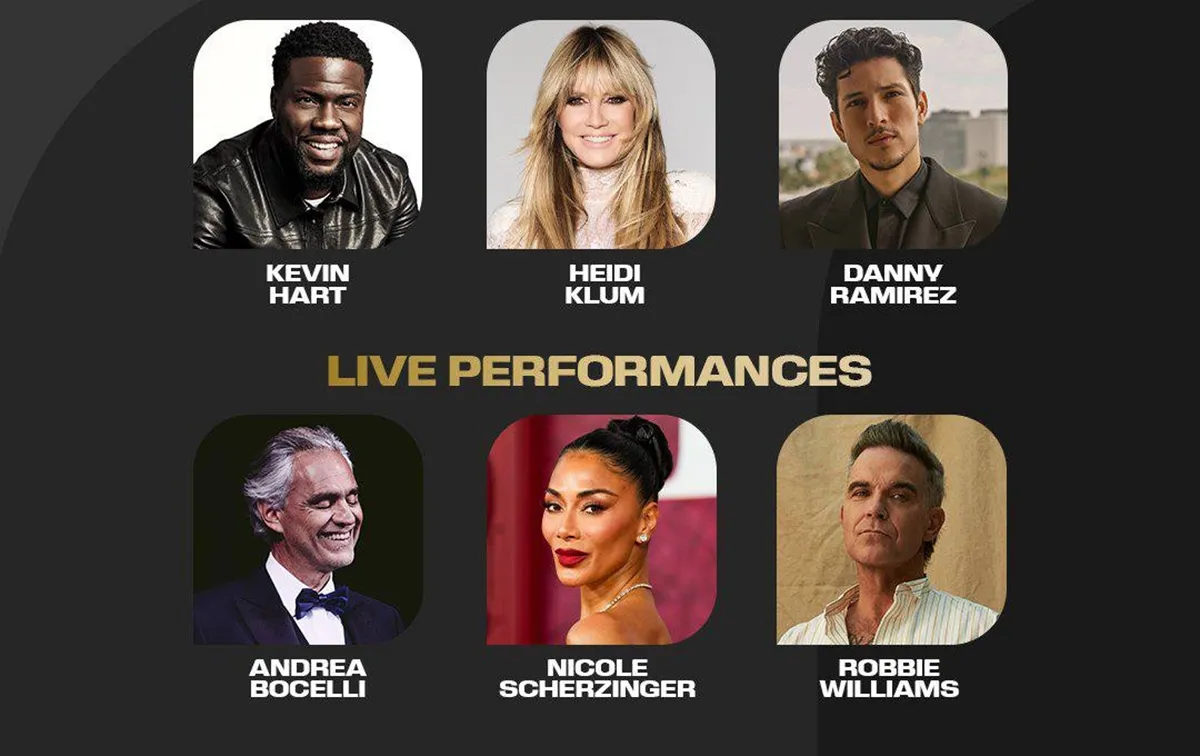 در بخش سرگرمی، مراسم میزبان اجراهای زنده باشکوهی خواهد بود. آندرهآ بوچلی، یکی از برجستهترین صداهای کلاسیک جهان، روی صحنه میرود. رابی ویلیامز، ستاره بزرگ موسیقی جهان، نیز به همراه نیکول شرزینگر، خواننده آمریکایی و هنرمند چندوجهی برنده جوایز متعدد، اجرا خواهد داشت. در پایان مراسم نیز گروه افسانهای ویلیج پیپل با اجرای سرود مشهور جهانی سالن را به شور خواهند آورد.