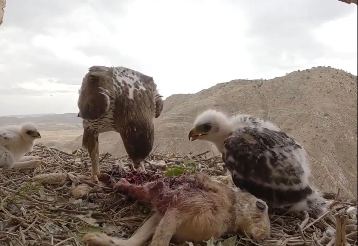 راستان | کوهنورد ایلامی تصاویری از غذا دادن یک عقاب (خرگوش) به جوجههایش در ارتفاعات زاگرس در ایلام را شکار کرده است. در این ویدئو دیده میشود که عقاب مادر به یکی از جوجههایش بیشتر توجه میکند. برخی فعالان محیط زیست و کاربران شبکههای اجتماعی از این نحوه فیلم برداری از این عقاب و جوجههایش ابراز نگرانی کردهاند. آنها می گویند اینگونه نزدیک شدن به جوجههای عقاب برای حیات آنها خطرناک است.