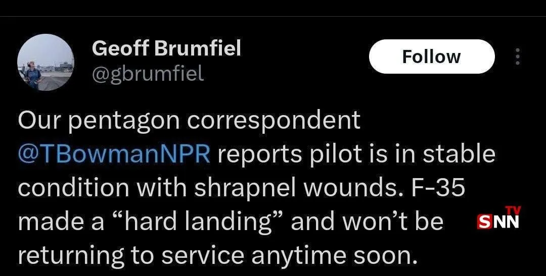 خبرنگار رادیو ملی آمریکا در صفحه پیامرسان ایکس خود از آسیب جدی خلبان F-۳۵ و فرود سخت آن نوشت: