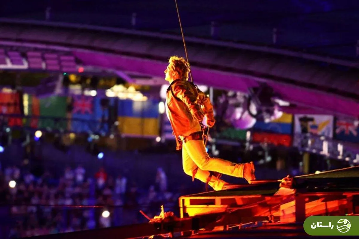 راستان | مراسم شب گذشته ستارگان فراوانی حضور داشتند از جمله تام کروز، هنرپیشه هالیوود که به سبک فیلمهای اکشن «تاپ گان» ابتدا از پشت بام «استد دو فرانس» پایین آمد تا پرچم المپیک را از پاریس تحویل و به شهر لسآنجلس آمریکا که میزبان بازیهای بعدی در سال ۲۰۲۸ است، برساند.