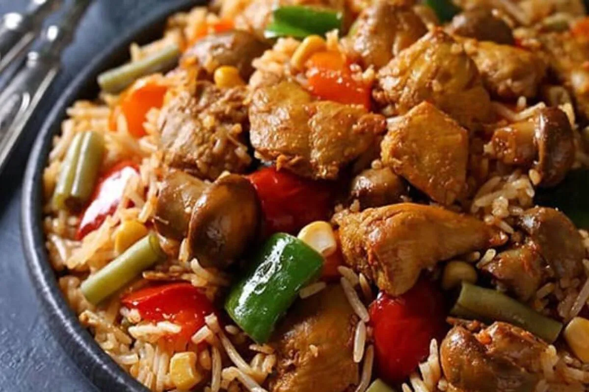در مرحله پایانی فلفل دلمهای و پیازچه را نیز خرد کرده و به قابلمه بیفزایید و اجازه دهید برنج بجوشد، در این مرحله درب قابلمه را بسته و بر روی حرارت متوسط تنظیم کنید تا آب برنج کشیده و برنج دم بکشد و بعد از زمان نیم ساعت نوش جان کنید.