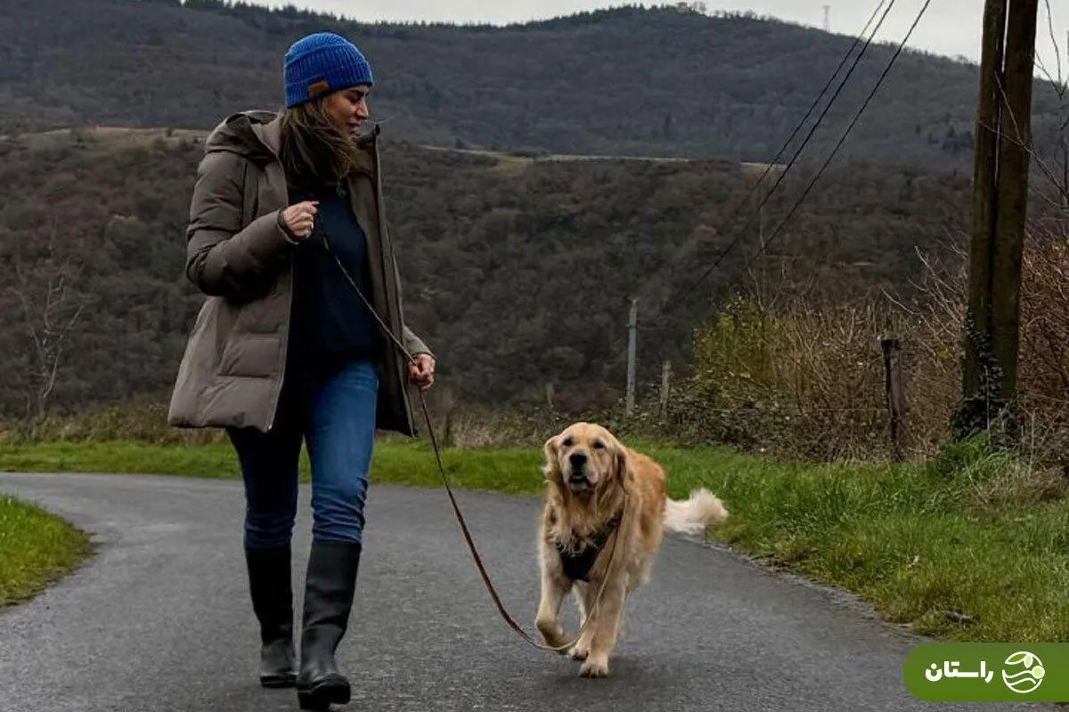 عکس | پیاده‌روی سحر دولتشاهی با سگش در یک جاده جنگلی