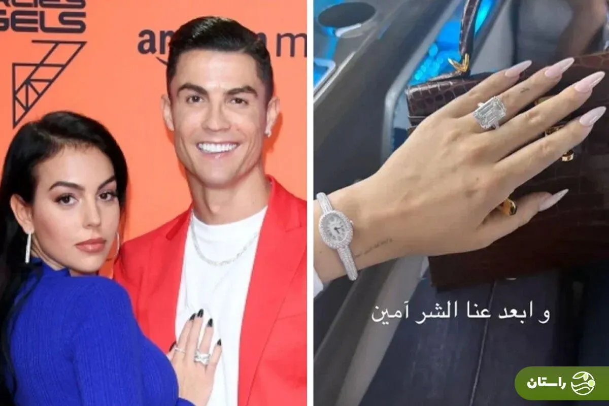 راستان | جورجینا رودریگز، دوست دختر کریستیانو رونالدو، با انتشار تصویری از یک انگشتر خیرهکننده در صفحه اینستاگرام خود، به شایعات مربوط به ازدواج احتمالی این زوج مشهور دامن زده است. رودریگز ۳۱ ساله که نزدیک به ۶۶ میلیون دنبالکننده در اینستاگرام دارد، عکسی از یک الماس مستطیلی شفاف را به اشتراک گذاشت و در کنار آن به زبان عربی نوشت: «و شر را از ما دور نگه دار، آمین.» جالب اینجاست که همین عبارت روی بدن او نیز خالکوبی شده است.