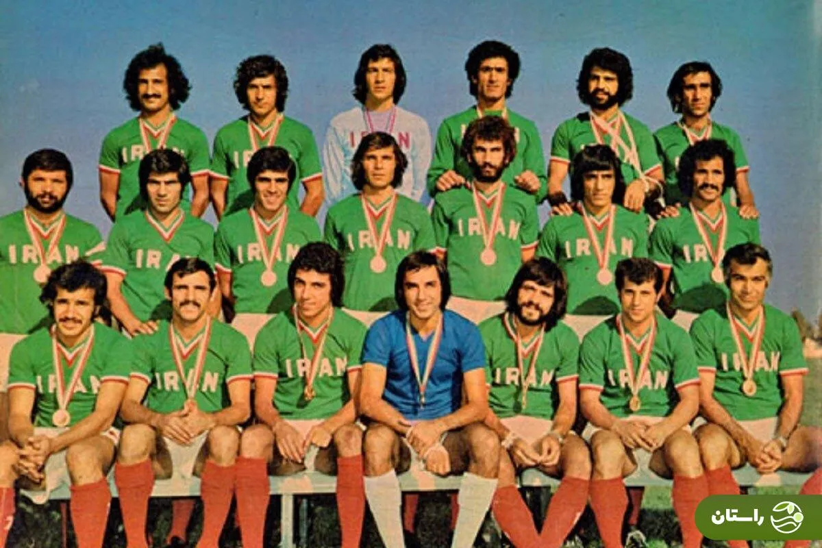 راستان | در این تصویر تیم ملی فوتبال در کنار گوگوش در سال ۱۳۵۳ دیده میشود. ایستاده از چپ به راست: علی جباری، حسن روشن، اسماعیل حاج رحیمی پور، جهانگیر نصیری، علی پروین و محمد دستجردی؛ نشسته از چپ به راست: غلامحسین مظلومی، علیرضا چهارمحالی، گوگوش، منصورپور حیدری و محمدرضا عادلخانی دیده میشوند.